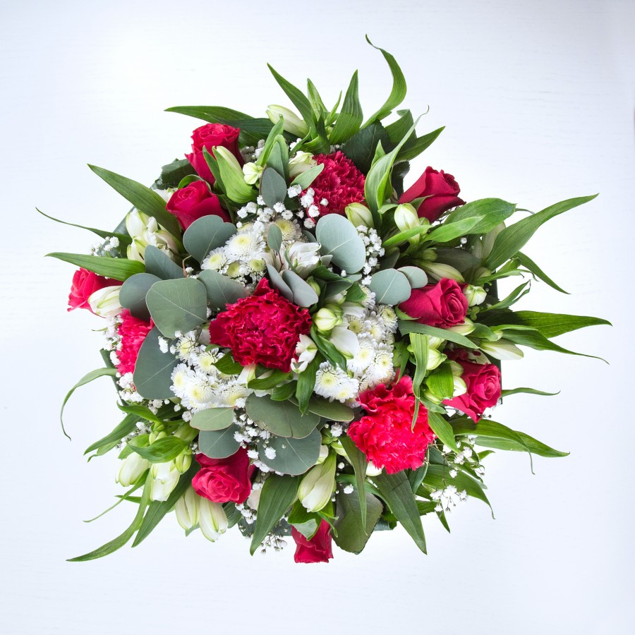 Our stunning handcrafted flower bouquet is designed to captivate and inspire. Featuring a unique combination of sweet white chrysanthemums, airy gypsophila, luxurious red roses, and carnations, all artfully arranged with white alstroemeria and elegant aspidistra leaves.